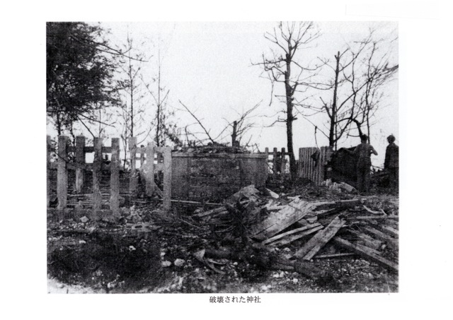 玉垣の中央に、基壇・石段のみになった社殿の焼跡が残る境内の光景