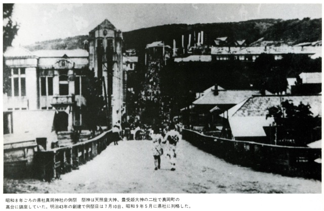 昭和8年ごろの県社真岡神社の例祭 祭神は天照皇大神、豊受姫大神の二柱で真岡町の高台に鎮座していた。明治43年の創建で例祭日は7月10日、昭和9年5月に県社に列格した。