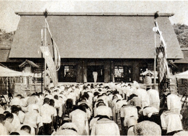 虔な気持ちで参拝する島民や島民小学生たち