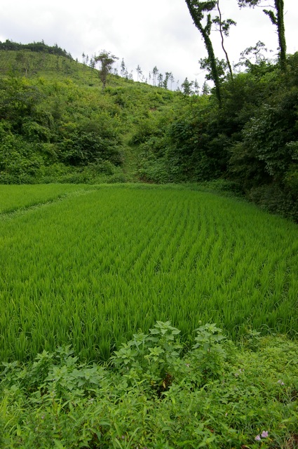 あぜ道。川を渡り、さらにあぜ道(写真左寄りを斜めに通る)を通り、山の傾斜路に取り付く。